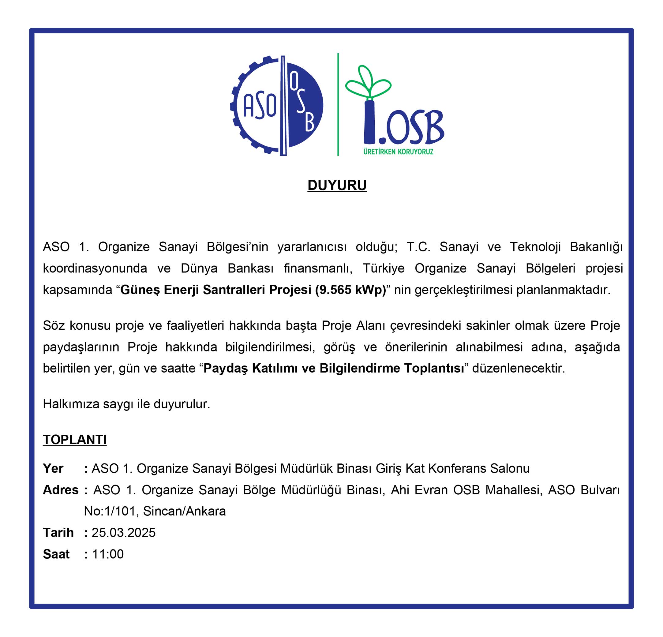 ASO 1. OSB PAYDAŞ KATILIMI VE BİLGİLENDİRME TOPLANTISI