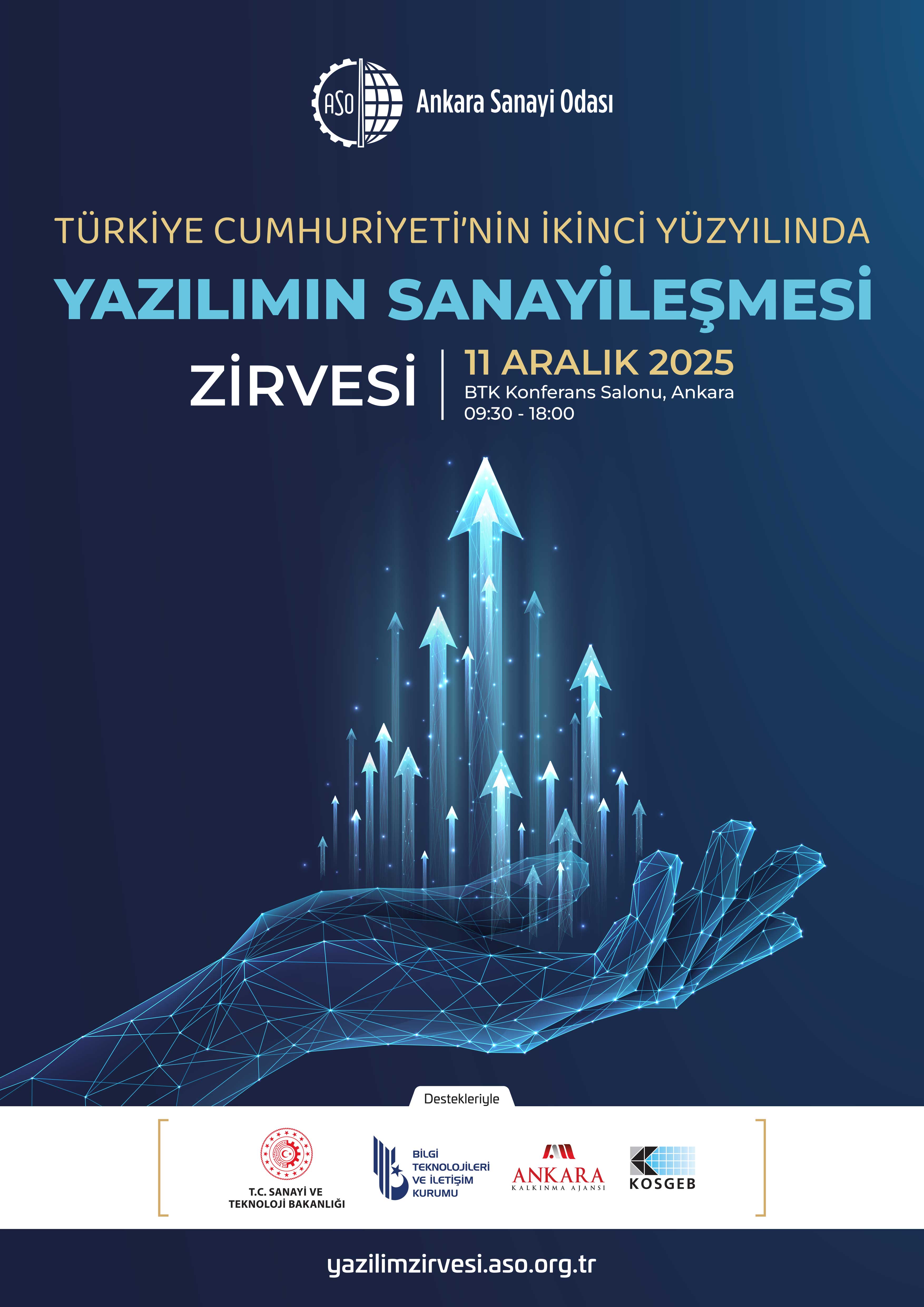 Ankara Sanayi Odası'ndan (ASO) Odamıza iletilen yazıda, ASO'nun 35. Bilgisayar Yazılımları Sanayi Meslek Komitesi koordinasyonunda, Bilgi Teknolojileri ve İletişim Kurumu (BTK) Konferans Salonu'nda "Türkiye Cumhuriyeti'nin İkinci Yüzyılında Yazılımın Sanayileşmesi Zirvesi"nin düzenleneceği belirtilmiştir.