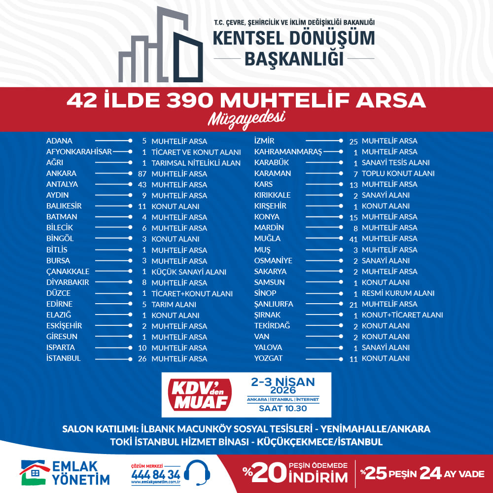 T.C. Çevre, Şehircilik ve İklim Değişikliği Bakanlığı ve Toplu Konut İdaresi Başkanlığı (TOKİ) bünyesindeki Emlak Yönetim Hizmetleri ve Ticaret A.Ş.'den Odamıza ulaşan yazıda; 2-3 Nisan 2026 tarihlerinde yapılacak olan 42 ilde 390 muhtelif arsa satışı kapsamında Ankara ilinde;
