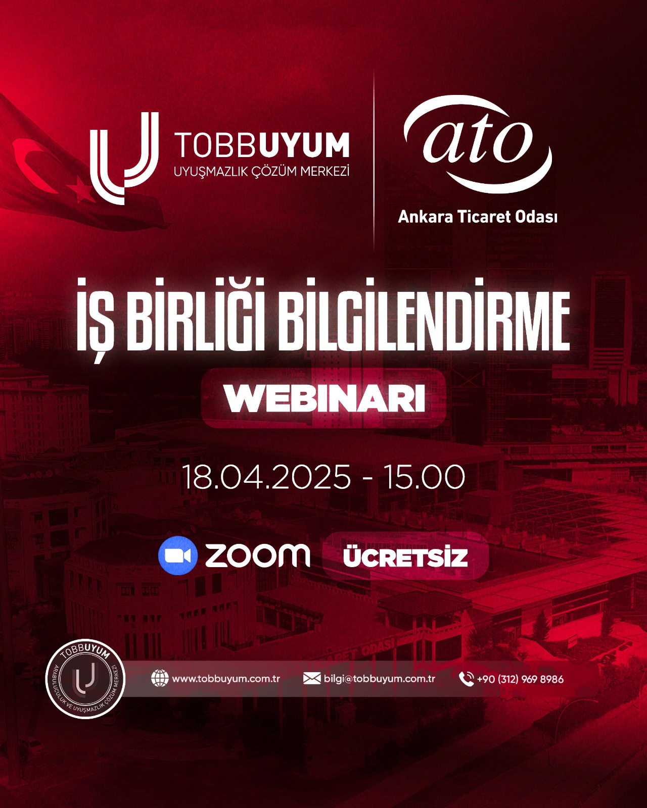 Ticari, tüketici, fikri ve sınai haklar, kira, hizmet, eser ve iş sözleşmelerinden doğan uyuşmazlıkları, profesyonel müzakereciler eşliğinde çözüme kavuşturma imkânı sağlayan hizmet hakkında, TOBBUYUM Uyuşmazlık Çözüm Merkezi'nden uzmanların detaylı bilgilendirme yapacağı Webinar'a kayıt yaptırarak, ücretsiz katılım sağlanabilecektir.