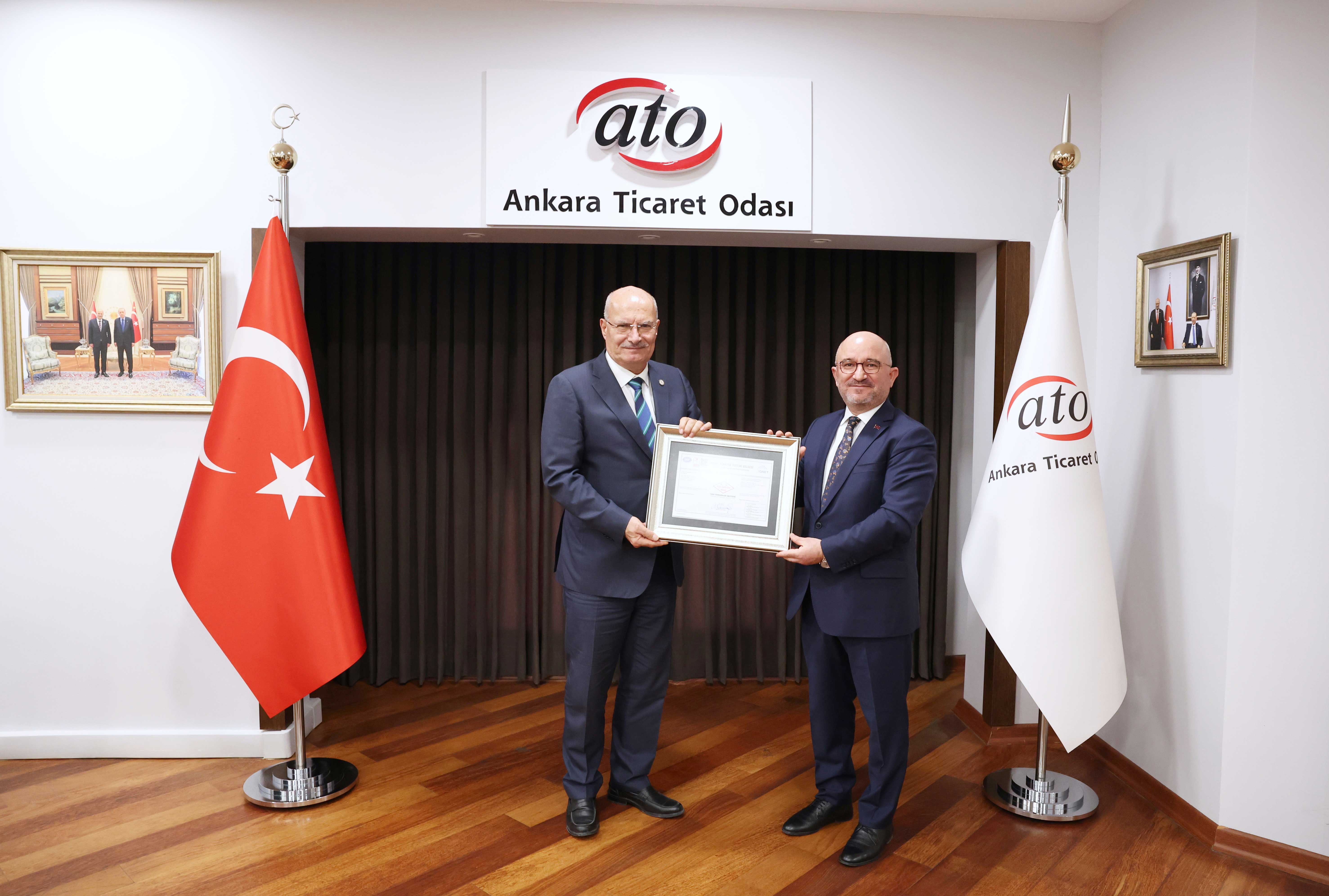 ANKARA TİCARET ODASI'NIN BELGELENDİRME DENETİMLERİNİ BAŞARIYLA TAMAMLAYARAK ALMAYA HAK KAZANDIĞI "TSE EN ISO 9001:2015 KALİTE YÖNETİM SİSTEMİ BELGESİ", ATO BAŞKANI GÜRSEL BARAN'A, TSE BAŞKANI MAHMUT SAMİ ŞAHİN TARAFINDAN TAKDİM EDİLDİ.