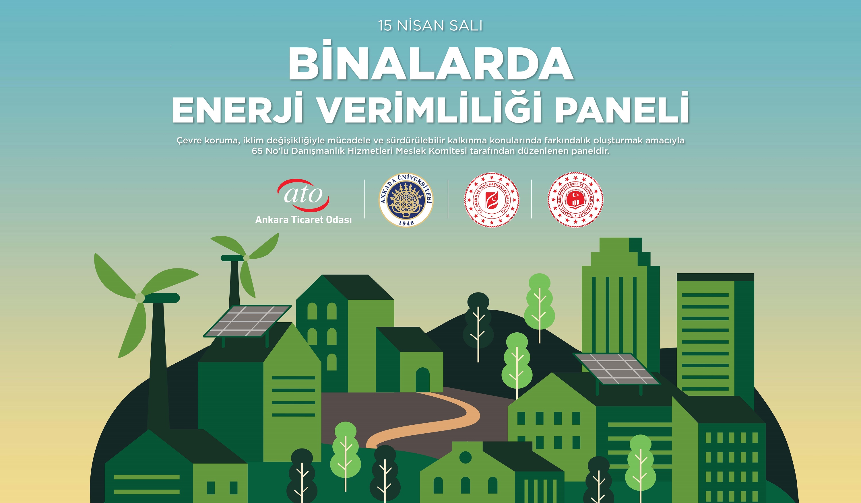 Ankara Ticaret Odası 65 No'lu Danışmanlık Hizmetleri Meslek Komitesi, çevre koruma, iklim değişikliğiyle mücadele ve sürdürülebilir kalkınma konularında farkındalık oluşturmak amacıyla, "Sürdürülebilir Gelecek Derneği" işbirliğiyle 15 Nisan 2025 Salı günü, 13.00-17.00 saatleri arasında Ankara Ticaret Odası Meclis Salonu'nda "Binalarda Enerji Verimliliği Paneli" gerçekleştirecektir.